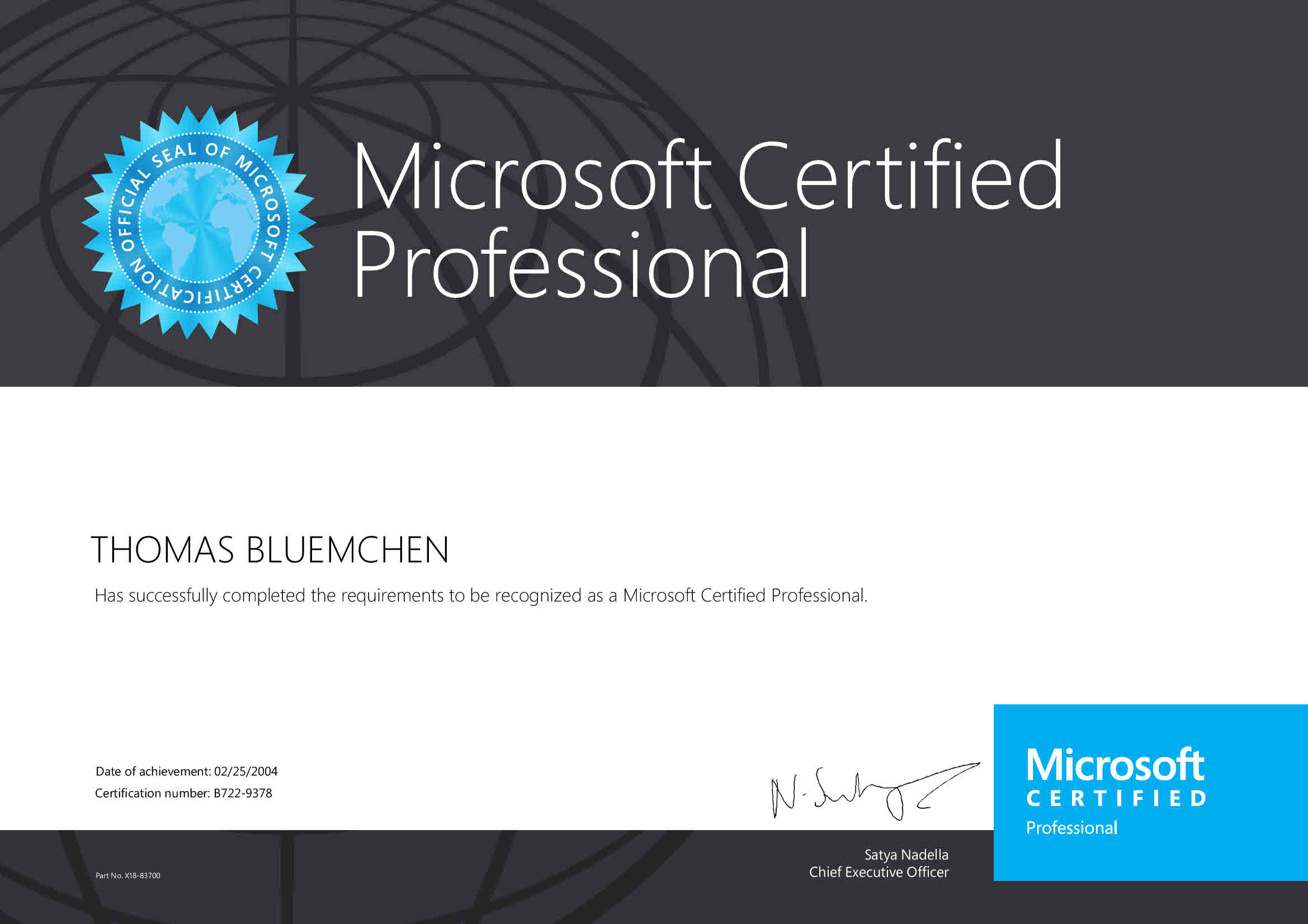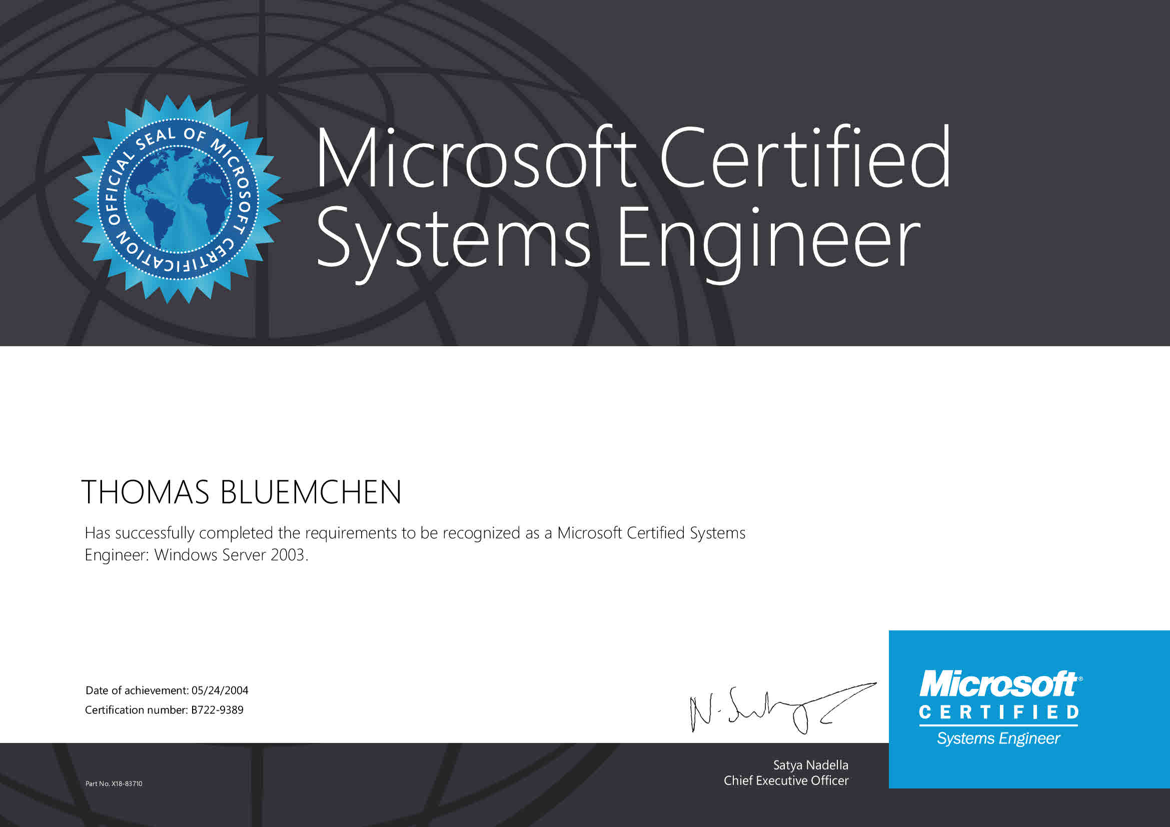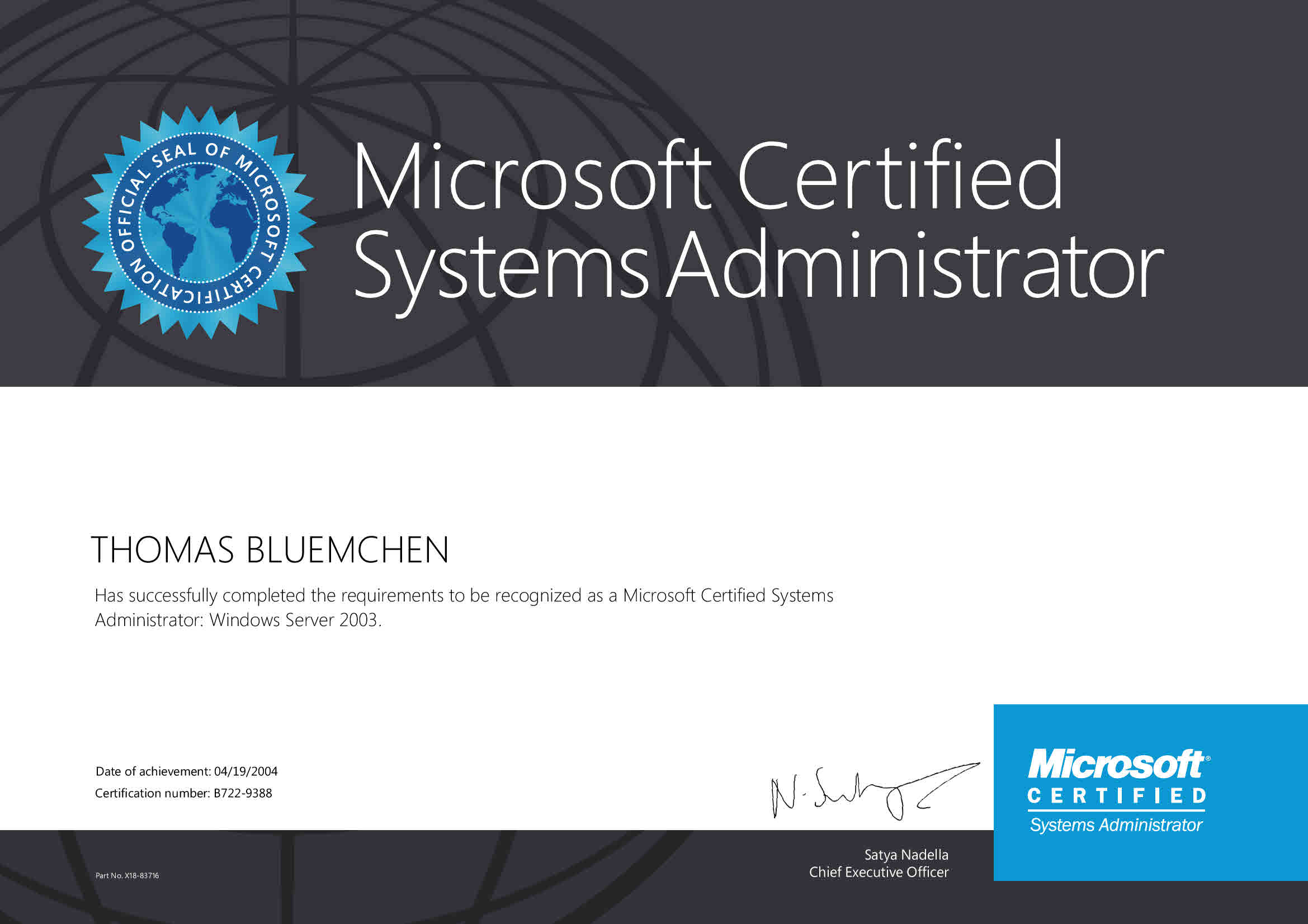 Microsoft-Zertifikate MSCE by Satya Nadella MCSE by Bill Gates MCSA by Satya Nadella MCSA by Bill Gates MCP by Satya Nadella MCP by Bill Gates Server Migration Prof.Einsatz von Win 7 Erstellung von MS- Apps